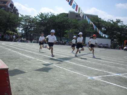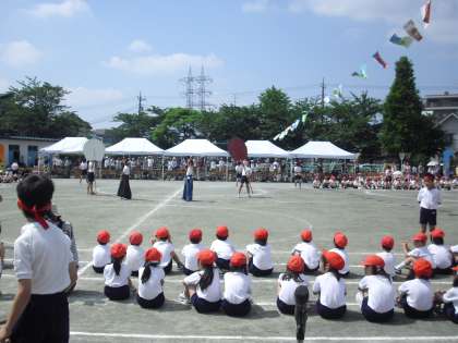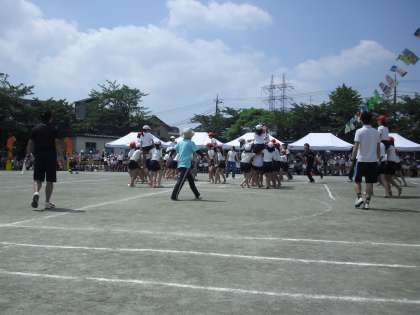 始めの運動、応援合戦と続き、3年生の短距離走、5・6年生女子の騎馬戦、1年生の演技と行われました。