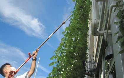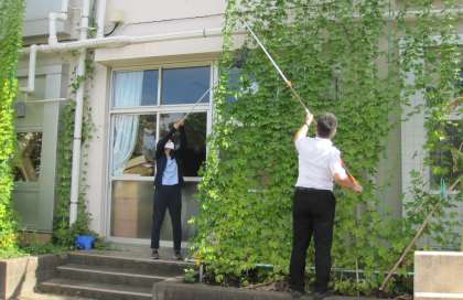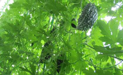 「実や種子のでき方」について学習をすすめています。教材研究でゴーヤを収穫しているところです。子どもたちは実物を観察します。2階の教室からも収穫することができます。