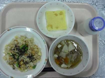 昨日のメニューは、ちらしずし、けんちん汁、パインケーキ、牛乳でした。