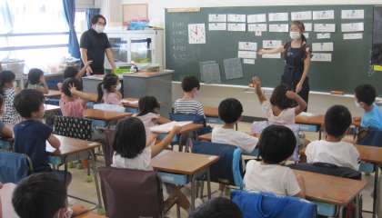 「としょかんと なかよし」の学習をしています。学校図書館司書をゲストティーチャーに図書館の使い方や本の分類について教えていただきました。