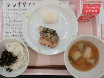 今日の給食は、ごはん、ひじきのふりかけ、牛乳、鯖の竜田揚げ、冬瓜のあんかけ汁、なしです。