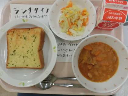 今日の給食は、ガーリックトースト、牛乳、コーンサラダ、ビーンズポークシチューです。