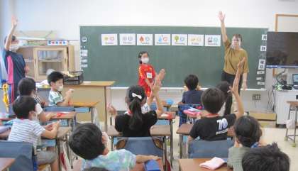 リズムに乗りながら、英語で「曜日」や「動物」についての学習をしました。教室は大盛り上がりです。ゲームを通して楽しみながら英語に慣れ親しんでいました。