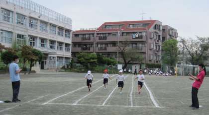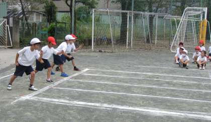 50メートル走。前を向いて、まっすぐに走る練習をしました。スタートのポーズは意気込みを感じます。