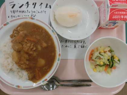 今日の給食は、チキンカレーライス、牛乳、キャベツサラダ、なしです。