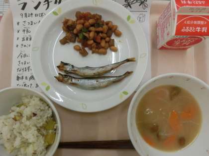 今日の給食は、さつまいもごはん、牛乳、五目豆、焼きししゃも、きのこのみそ汁です。