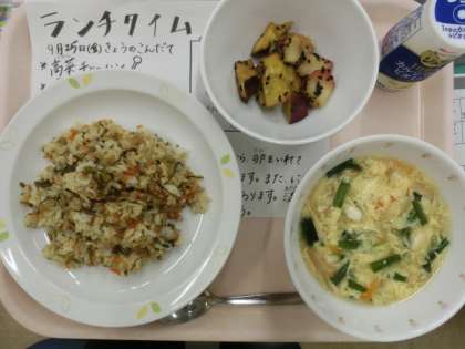 今日の給食は、高菜チャーハン、ジョア、にらたまスープ、りんご入り大学芋です。