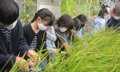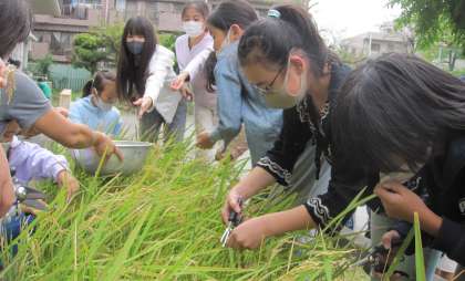 休校期間中に理科支援員が種もみから発芽させた苗。担任が田植えをして、おやじの会のみなさんにネットを張っていただき、子どもたちが育てた稲は、立派に成長しました。稲刈りを体験し、たくさん収穫することができました。