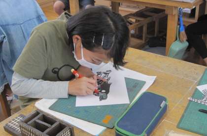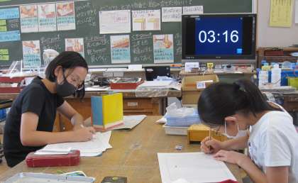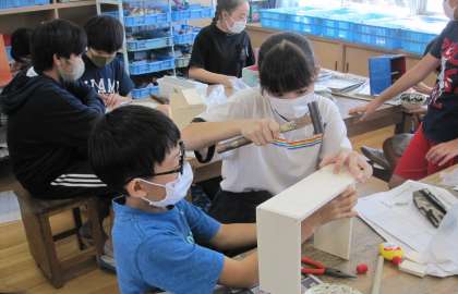 「私はデザイナー」思い思いの作品をデザインして、楽しい棚や入れ物をつくりました。学習を進める中で、釘打ちやのこぎり、ニス塗りの技能が向上しました。完成した子は、学習の振り返りをしたり、切り絵に挑戦したりしました。