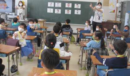 体の調子や気持ちについて学習ました。ジェスチャーをつけながら、リズムよく発音しています。クイズ形式の問題に正解すると、みんなからGood job. と言われ、うれしそうにしていました。