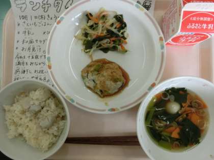 今日の給食は、さといもごはん、牛乳、ひじきと枝豆のつくね、和風サラダ、お月見汁です。
