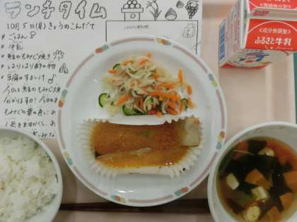 今日の給食は、ごはん、牛乳、鮭のもみじ焼き、はりはり酢の物、豆腐のすまし汁です。