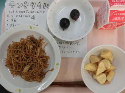 今日の給食は、ソース焼きそば、牛乳、大豆とおいものからあげ、巨峰です。