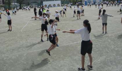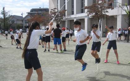 休み時間にも意欲的に練習しています。長縄跳びの技能向上は目を見張るものがあります。