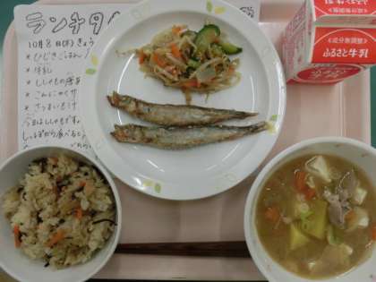 今日の給食は、ひじきごはん、牛乳、ししゃものからあげ、こんにゃくサラダ、さつまいも汁です。