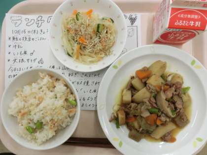 今日の給食は、鮭と枝豆のごはん、牛乳、いも煮、大根サラダです。