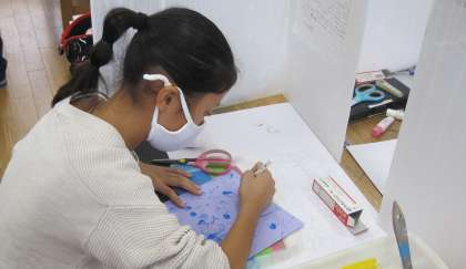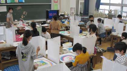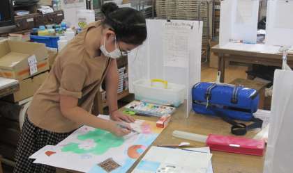 「ステキなへんてこ山」の物語をつくり、物語の一場面をイメージして、作品作りをしています。様々な技法で作った『自分色紙』を使って、アート作品に仕上げていきます。