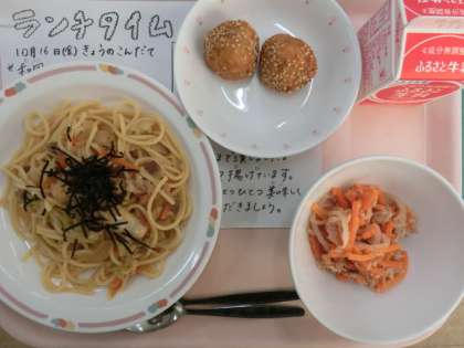 今日の給食は、和風スパゲティ、牛乳、にんじんとツナのサラダ、さつまいも入りごま団子です。