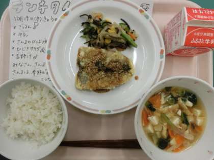 今日の給食は、ごはん、牛乳、さんまのかば焼き、ひじきサラダ、吉野汁です。