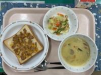 今日の給食は、カレーうどん、牛乳、ちくわの磯部揚げ、柿です。