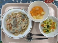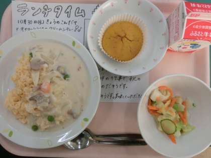 今日の給食は、キャロットライスのクリームシチュー、牛乳、フレンチサラダ、かぼちゃマフィンです。