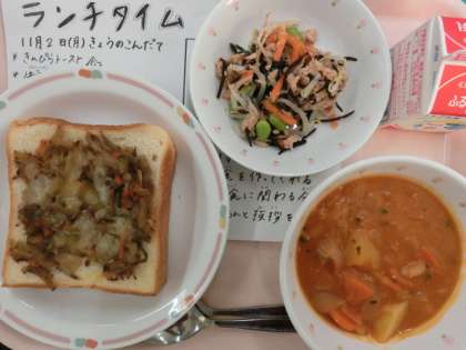 今日の給食は、きんぴらトースト、牛乳、ひじきと枝豆のサラダ、ビーンズポークシチューです。