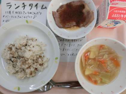 今日の給食は、ベーコンときのこのピラフ、牛乳、ぶたの実のアップルジンジャーソース、野菜スープです。