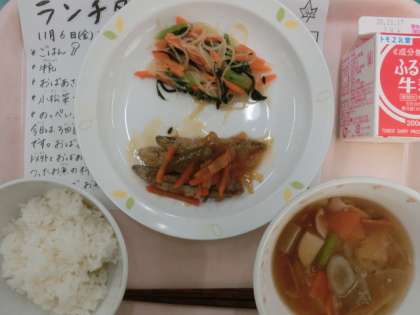 今日の給食は、ごはん、牛乳、おばあさんのお魚料理、小松菜サラダ、のっぺい汁です。