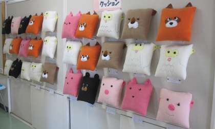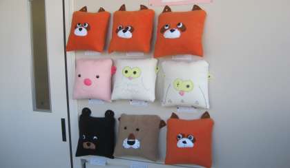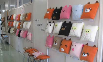 6年生の子どもたちが家庭科の時間に作製した「ZOO クッション」を家庭科室前に展示しています。