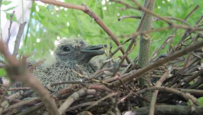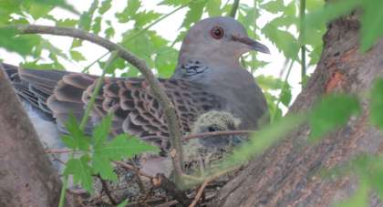 鳩が木の上に巣をつくり、1か月程前から卵を温めていました。昨日、可愛らしい雛がかえりました。
