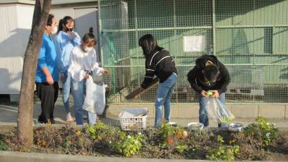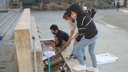 飼育委会、朝の活動です。飼育小屋を清掃して、えさの準備をしました。メープル、ショコラも気持ちよさそうです。