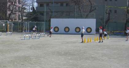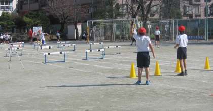 小型ハードル走の学習をしています。ICT機器を活用し、動きを確認して自己の課題を見付けています。グループの友達と協力してタイム計測もしていました。