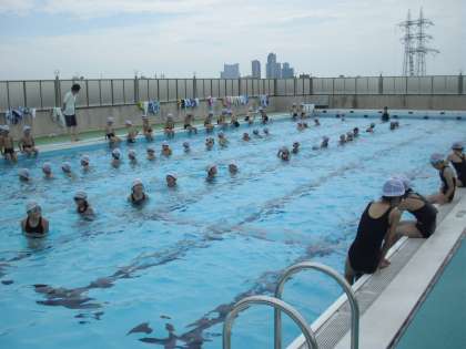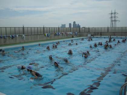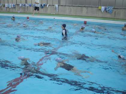 昨年は、サブのプールでの学習が多かった3年生。今年は、大きいプールで学習します。水位を下げて安全に行います。一人一人めあてをもち、力を伸ばします。