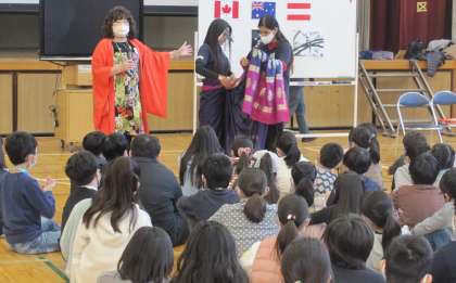 4年生は毎年、区の教育センターにある異文化体験施設「Touch the World」に行って学習をしています。今年度は、講師の先生方が学校にいらしてくださり、学習しました。本校の体育館が異文化体験の場になり、外国の文化に触れたり、日本の文化を確かめたりしました。