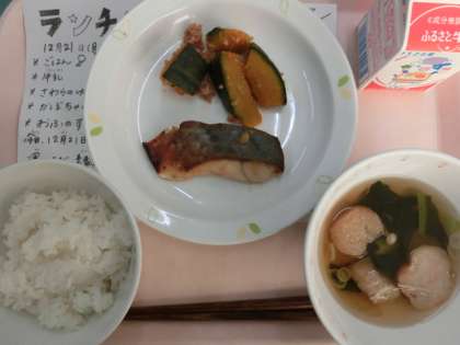 今日の給食は、ごはん、牛乳、さわらのゆずみそ焼き、かぼちゃの含め煮、お麩のすまし汁です。