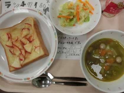 今日の給食は、アップルトースト、ジョア、コーンサラダ、れんこんのカレースープです。