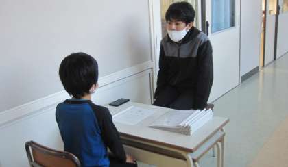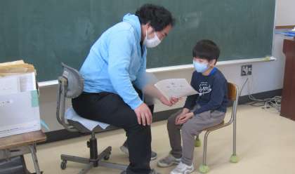 2学期に努力したこと、成長したことなどを担任が子どもたち一人一人に伝えていました。