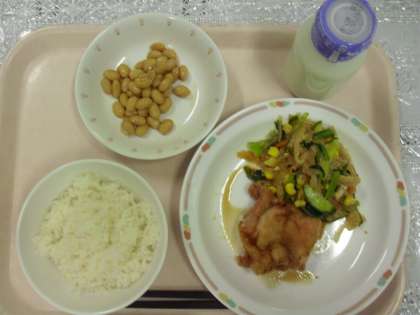 今日のメニューは、ご飯、鶏肉のレモン漬け、糸寒天のゴマ酢あえ、ぶどう豆、牛乳でした。