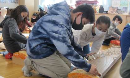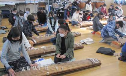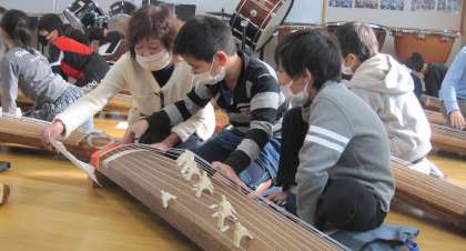和楽器、箏の演奏を通して日本の伝統文化に親しみました。講師の先生に、箏についての説明、座り方、指の形、弾き方を教えていただき、1時間の練習で「さくら さくら」の演奏をすることができるようになりました。子たちがお互いに教え合いながら真剣に取り組む態度が印象的でした。