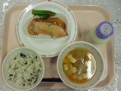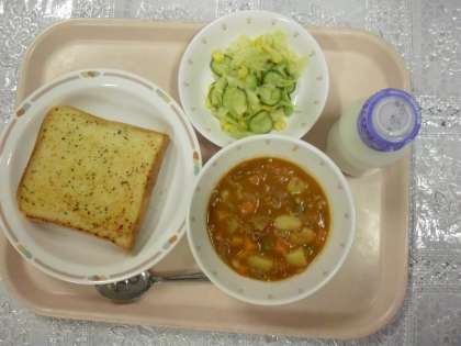 5日のメニューは、わかめご飯、しゃけの味噌マヨネーズ焼き、オクラのおかかあえ、冬瓜のあんかけ汁、牛乳でした。6日は、ガーリックトースト、ポークビーンズ、アーモンドサラダ、牛乳でした。