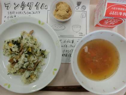 今日の給食は、小松菜チャーハン、牛乳、大根のみぞれ汁、あしたばだんごです。