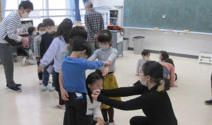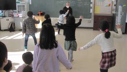 パブリックシアターの劇団の方が来校し、1年生を対象に授業を行いました。子どもたちがもっている発想力、表現力を引き出し、子どもたちは夢中になって取り組んでいました。