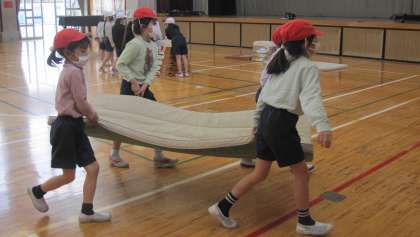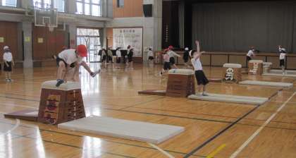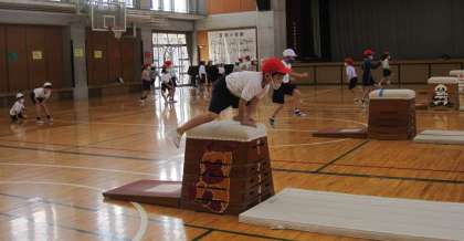 体育の授業「とびばこあそび」では、リズミカルな助走から調子よく跳び越していました。着地もピタッときめていました。安全確認や準備、片付けは約束を守ってできました。