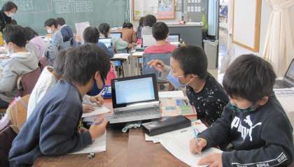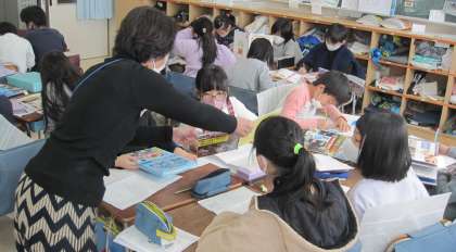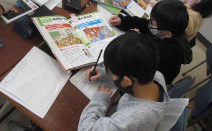 興味をもった国について調べ学習を進めています。同じ国を調べている子どもたちがチームになり、情報交換をしながら学習をしています。本とタブレットを併用して、その国の食事や学校、自然などについて熱心に調べていました。