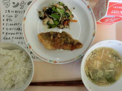 今日の給食は、ごはん、牛乳、たらのねぎソース、ちくわ入り磯辺和え、わかめのみそ汁です。