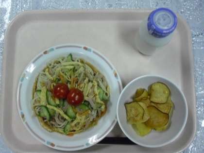 11日は、キムチチャーハン、チヂミ きゅうりのひとしお、春雨スープ、牛乳でした。12日は、麦ごはん、鯵のかば焼き、磯辺あえ、味噌汁、牛乳でした。13日は、冷やし中華、ミニトマト、サツマイモチップ、牛乳でした。