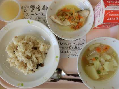 今日の給食は、チキンピラフ、牛乳、たらの蒸し煮ロシア風、オールド・ファッションド・ボイルド・ディナー、りんごゼリーです。