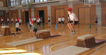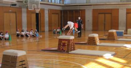 跳び箱を使った運動遊びに取り組んでいます。跳び箱に跳び乗り、ジャンプをして跳び降りたり、リズムよく跳びこしたりして楽しんでいました。