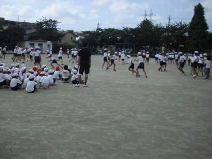 猛暑続きですが、朝の気温がまだ上がらない時間に、体育朝会として、「手つなぎ鬼」をしました。時間を短くして、暑さ対策をしながら「子どもたちが仲良くしながら汗をかいて、体力を」と行いました。また、50周年の出し物の練習も5・6年生合同で行いました。