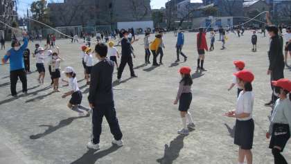 長縄跳びをして遊んでいる子がたくさんいます。1年生のグループは教員と支援員が回し手を担当しました。6年生は上手にダブルダッチをしていました。